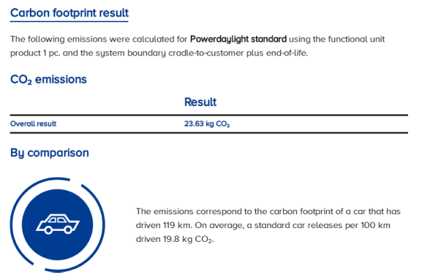 Par ailleurs, une Product Carbon Footprint (PCF) a été établie pour le tube de lumière naturelle Powerdaylight. Ces calculs ont été réalisés selon une approche cradle-to-gate plus end-of-life. Cela signifie que l’impact CO₂ a été évalué depuis l’extraction des matières premières, en passant par la production et le transport, jusqu’à la phase de fin de vie, incluant le traitement des déchets et le recyclage.