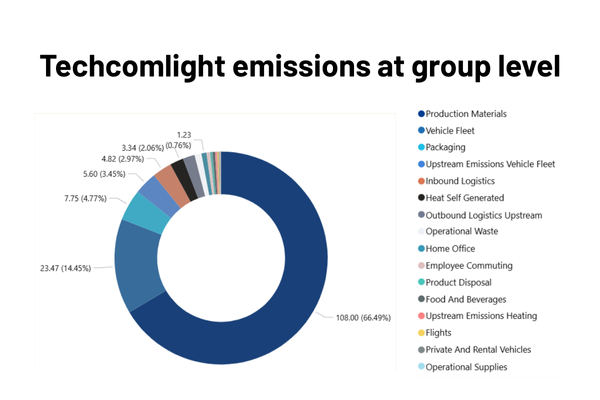 Au niveau de l’entreprise, Techcomlight a calculé l’intégralité de son empreinte carbone, couvrant les scopes 1, 2 et 3. Cela inclut non seulement notre propre consommation d’énergie et nos transports, mais aussi les émissions tout au long de la chaîne de valeur, telles que les matériaux achetés et la logistique. Cette analyse constitue une base essentielle pour des actions de durabilité ciblées.